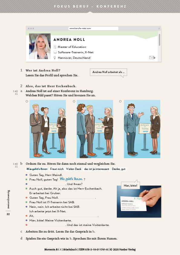 Anhand von typischen, beruflich relevanten Kommunikationssituationen werden zusätzlich Redemittel und Wortschatz vermittelt und trainiert.