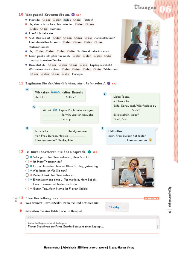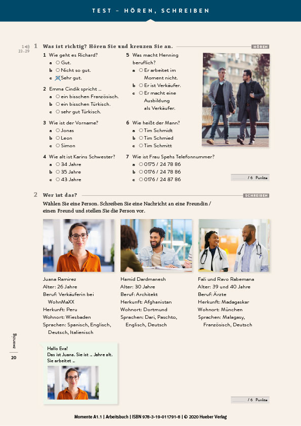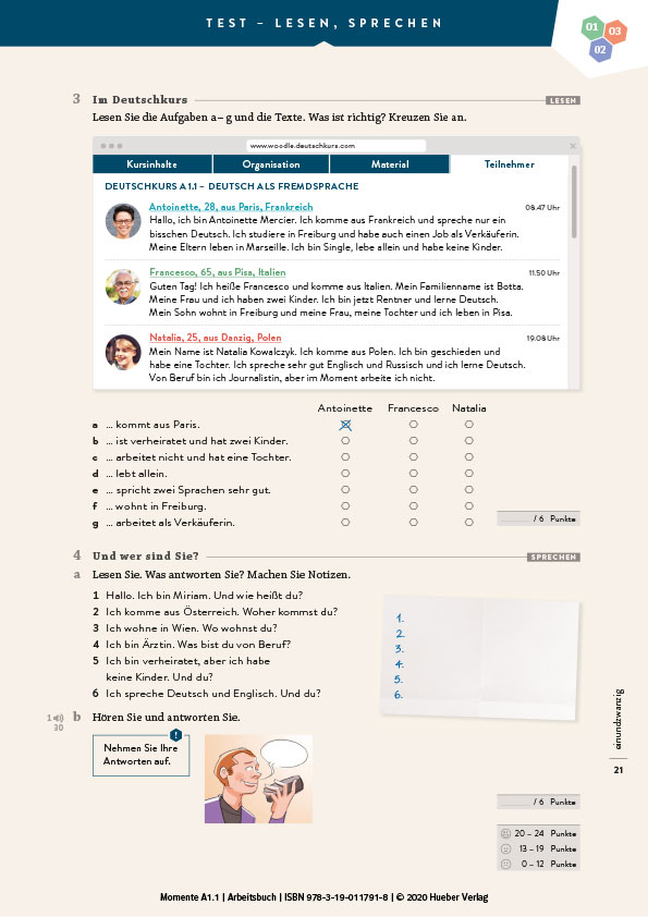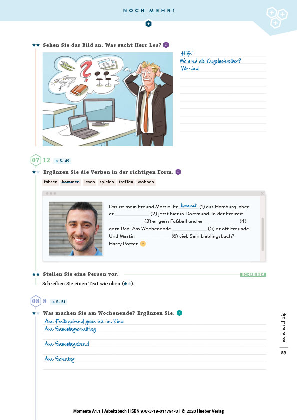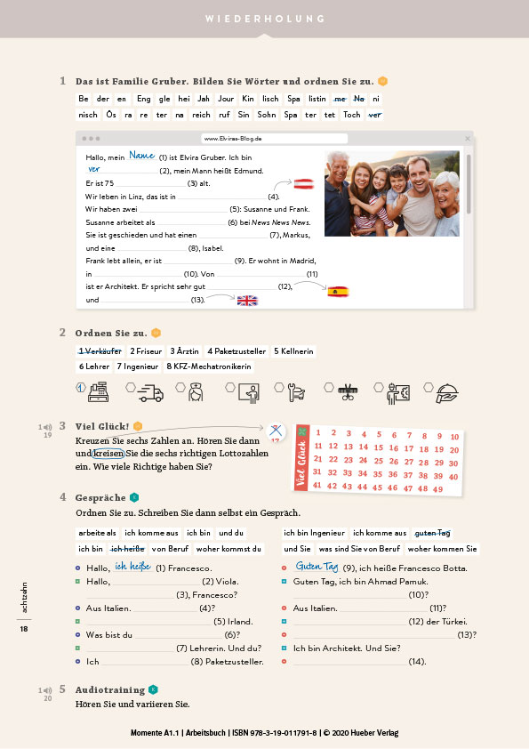 Der Stoff der letzten drei Lektionen wird in abwechslungsreichen Übungen noch einmal aufgegriffen – sortiert nach den Kategorien Wörter, Kommunikation und Grammatik.